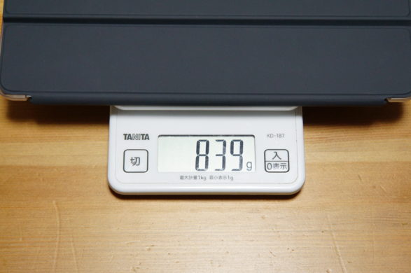 約109gとケースは軽量だけど、Smart Keyboardと一緒に装着すると、総重量は839gなので、片手で持つにはちょっと重さを感じる。