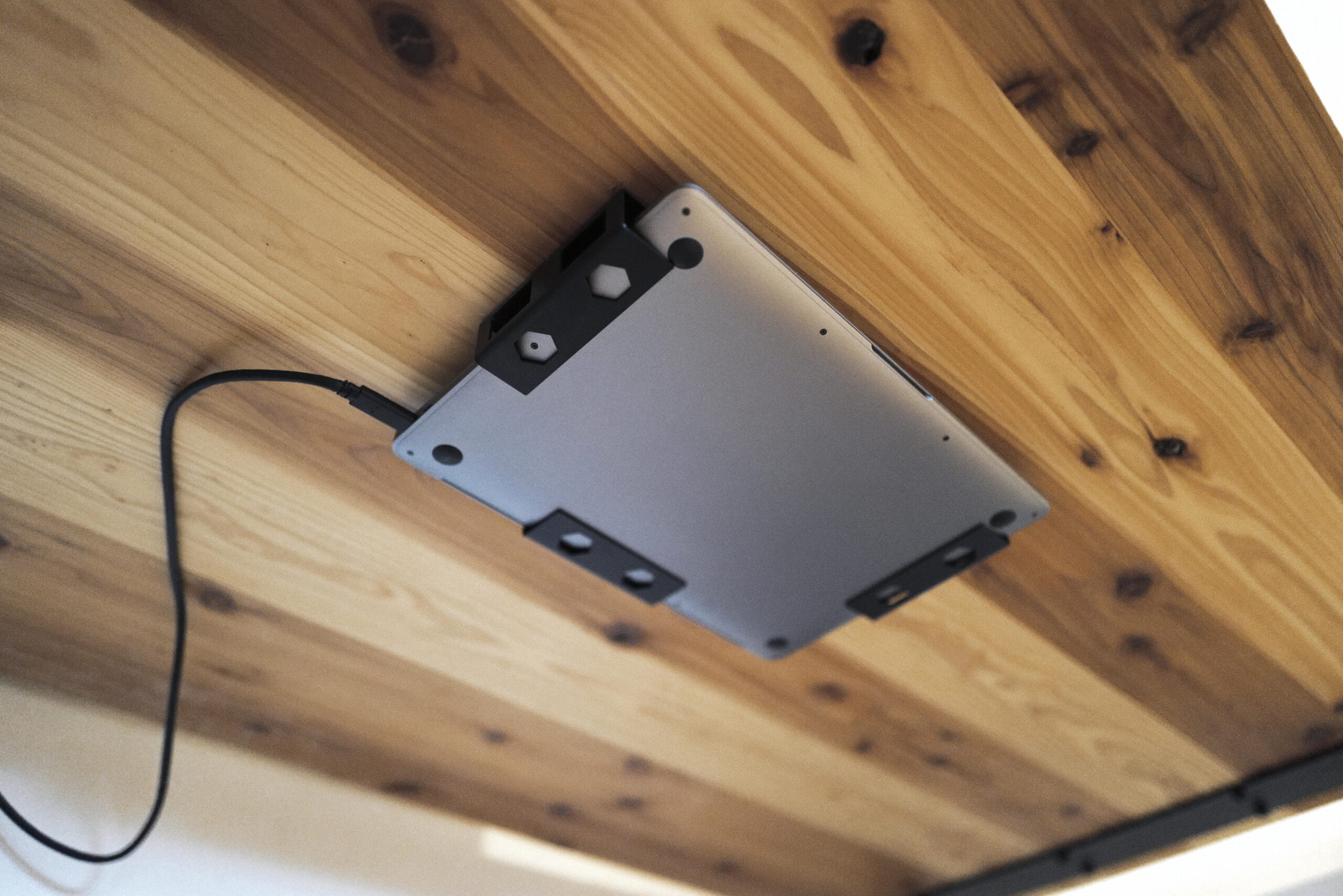 初めは、デスク下ノートパソコンホルダーでも良いかなって思ったが、モニターからMacBook AirまでのUSB-Cケーブルが長くなりすぎるのが嫌なのと、ハブを使ってデータのやり取りがしやすくしたかったので、デスク下に張り付けることにした。
