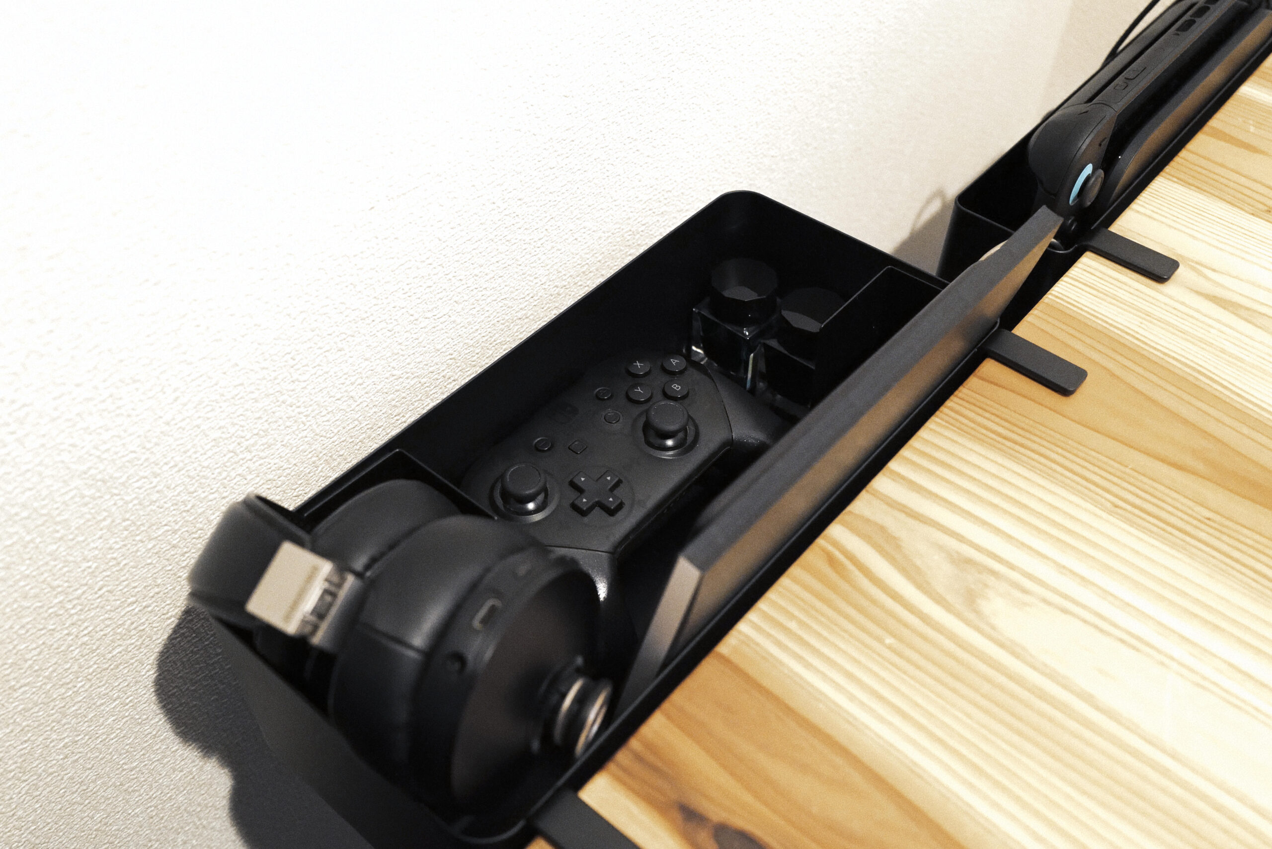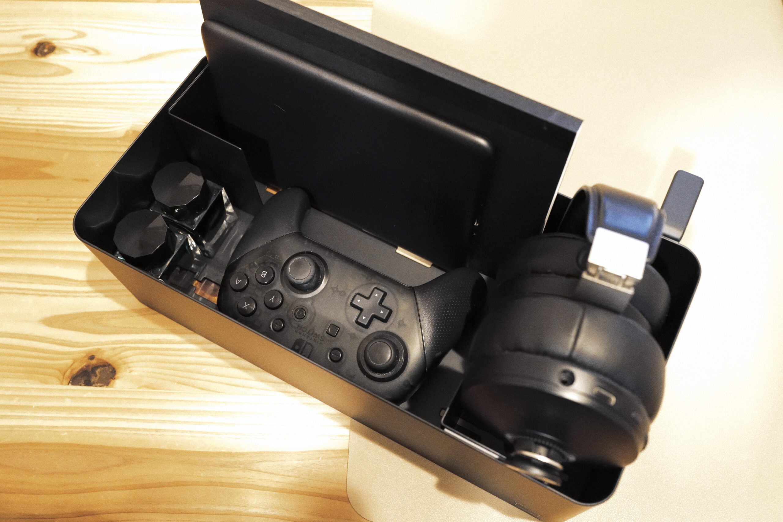 収納したのは、万年筆のインク、Kindle、ノート、ヘッドホン、Switch プロコンを入れた。これらはほぼ毎日使っているモノだからデスク上に置いていても問題ないが、やっぱりスッキリさせたいということで、追加でバスケットを買ってしまったのである。